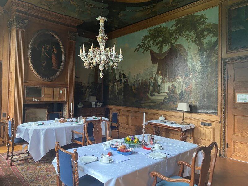 De sfeer vond ik echt heerlijk in het kasteel. Op drie vaste tijden gedurende dag is er ontbijt, lunch en diner. Tussen de middag wordt de warme maaltijd gegeten, ’s avonds de broodmaaltijd. De gasten zitten met z’n allen aan een luxe gedekte tafel. Tussen de maaltijden door is er voldoende tijd om te wandelen, bij te slapen, in de bibliotheek te werken, koffie te drinken in de woonkamer. Je kunt je aansluiten bij ander gezelschap, maar ook ervoor kiezen om je af te zonderen en een dagdeel alleen te vermaken. En natuurlijk is de inrichting van het kasteel prachtig, vol met details. Kroonluchters. Schilderingen op zowel de wanden als het plafond. Je wordt volledig in de watten gelegd, de sfeer is heel gemoedelijk. Het gastenverblijf wordt door een 40-tal (gepensioneerde) vrijwilligers gerund en geven je een heel warm welkom. Ik raad het kasteel zeker aan om eens te overnachten voor als je een keer wat anders dan anders wilt.